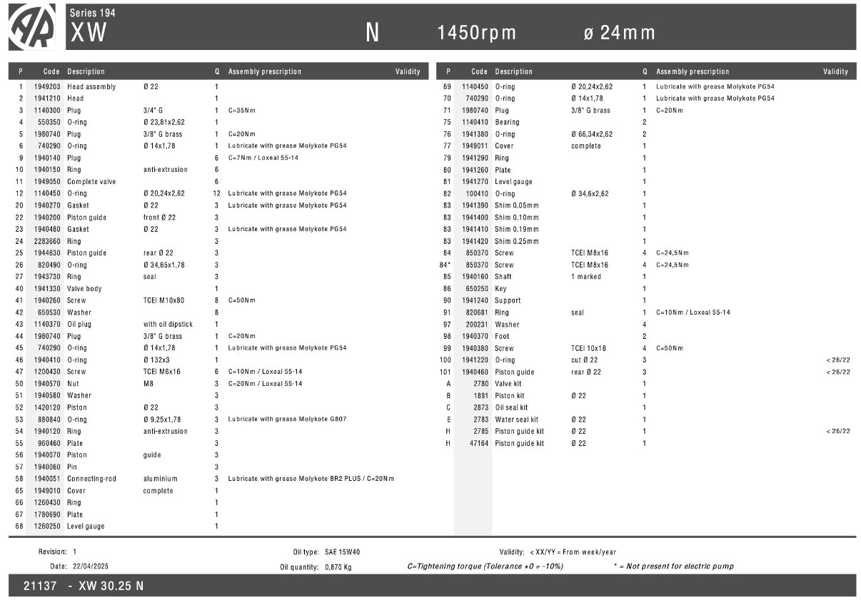 The XW 30.25 Annovi Reverberi solid shaft pump is engineered for industrial cleaning units and other high-demand systems. Operating at 1450 RPM, this pump features a robust 24mm solid shaft designed for coupling with electric motors.