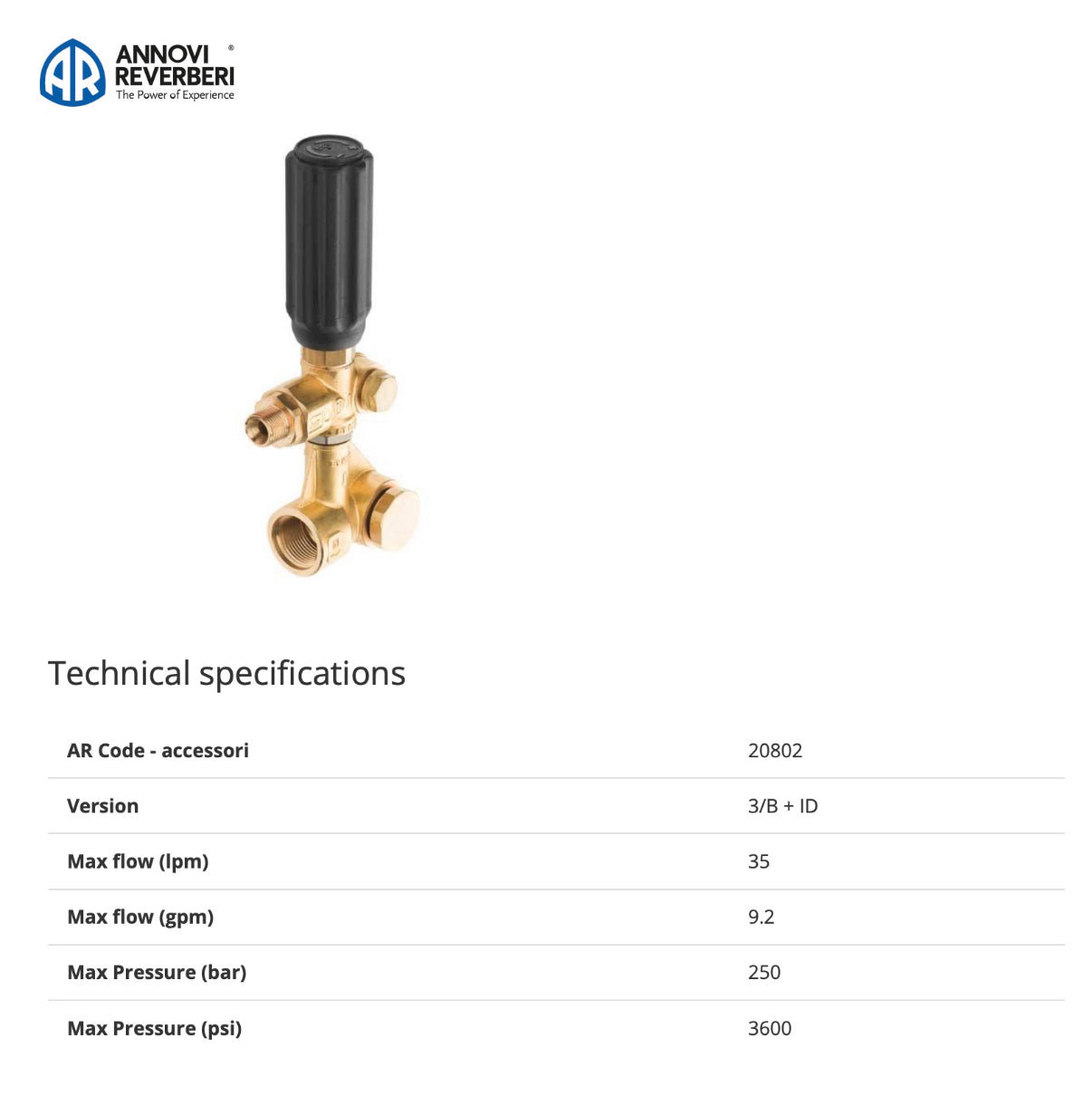 Ask about Annovi Reverberi Gymatic 3B Unloader Valve – 250 Bar – Control Set with Built-in Bypass – Part No: 20080 / 20802